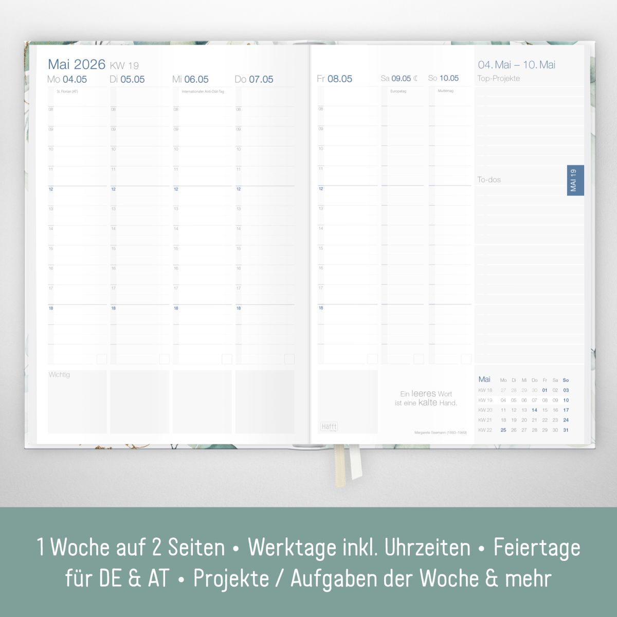 - BUSINESS-PLANER 2026 A5 - Kalender für 12 Monate mit 1 Woche auf 2 Seiten, Lesebändchen, Monatsvorschau für jeden Monat und einer großen Jahresübersicht zum Aufklappen. Die Laufzeit ist von Januar bis Dezember 2026.