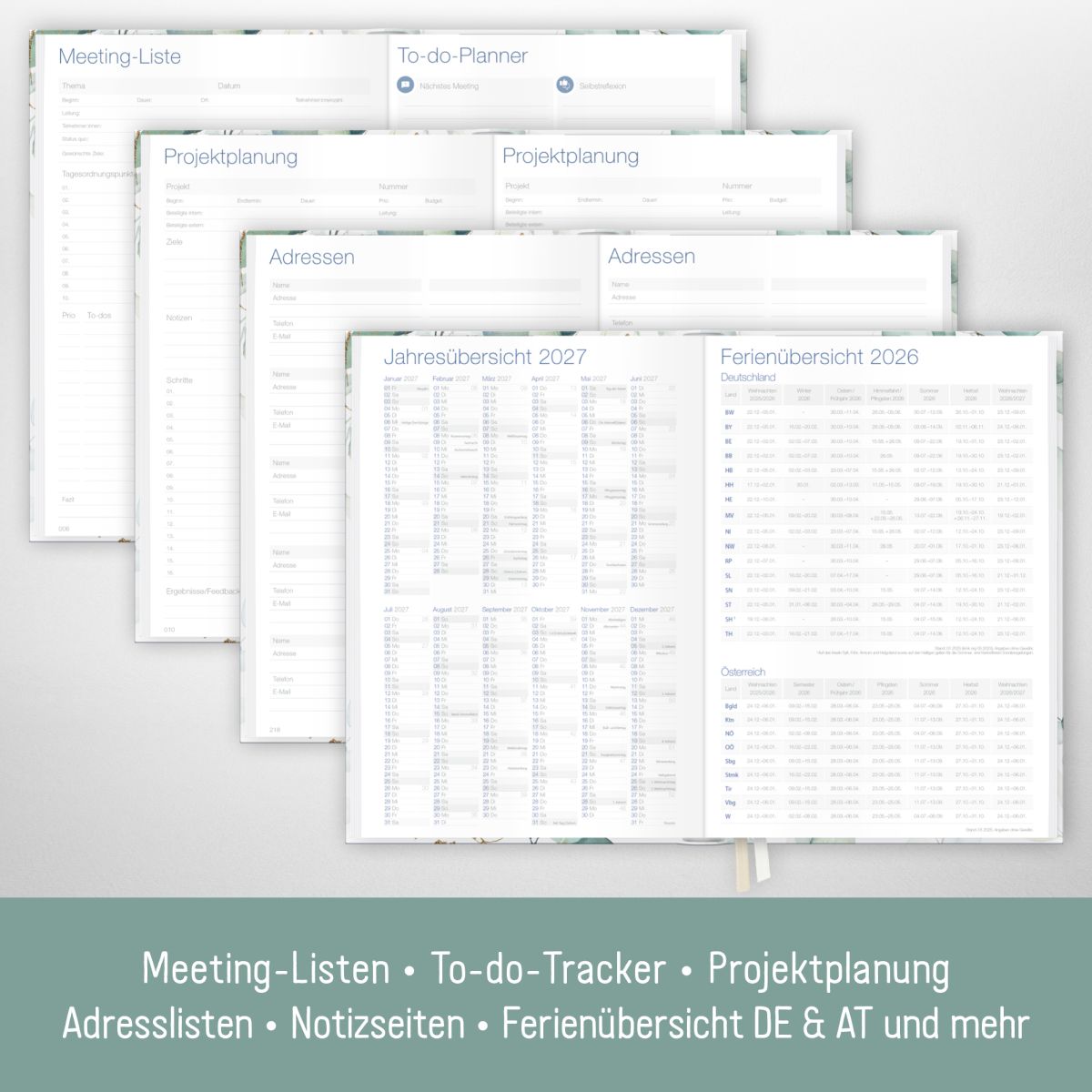- DURCHDACHT & ÜBERSICHTLICH - Kalendarium mit Halb-Stunden-Takt, wöchentliche Top-Projekte und TO DOs, Projektplaner, Meeting-Listen, inspirierende Sprüche, Adress-Listen, Länderknigge, praktischer Fahrtkostenübersicht und mehr.