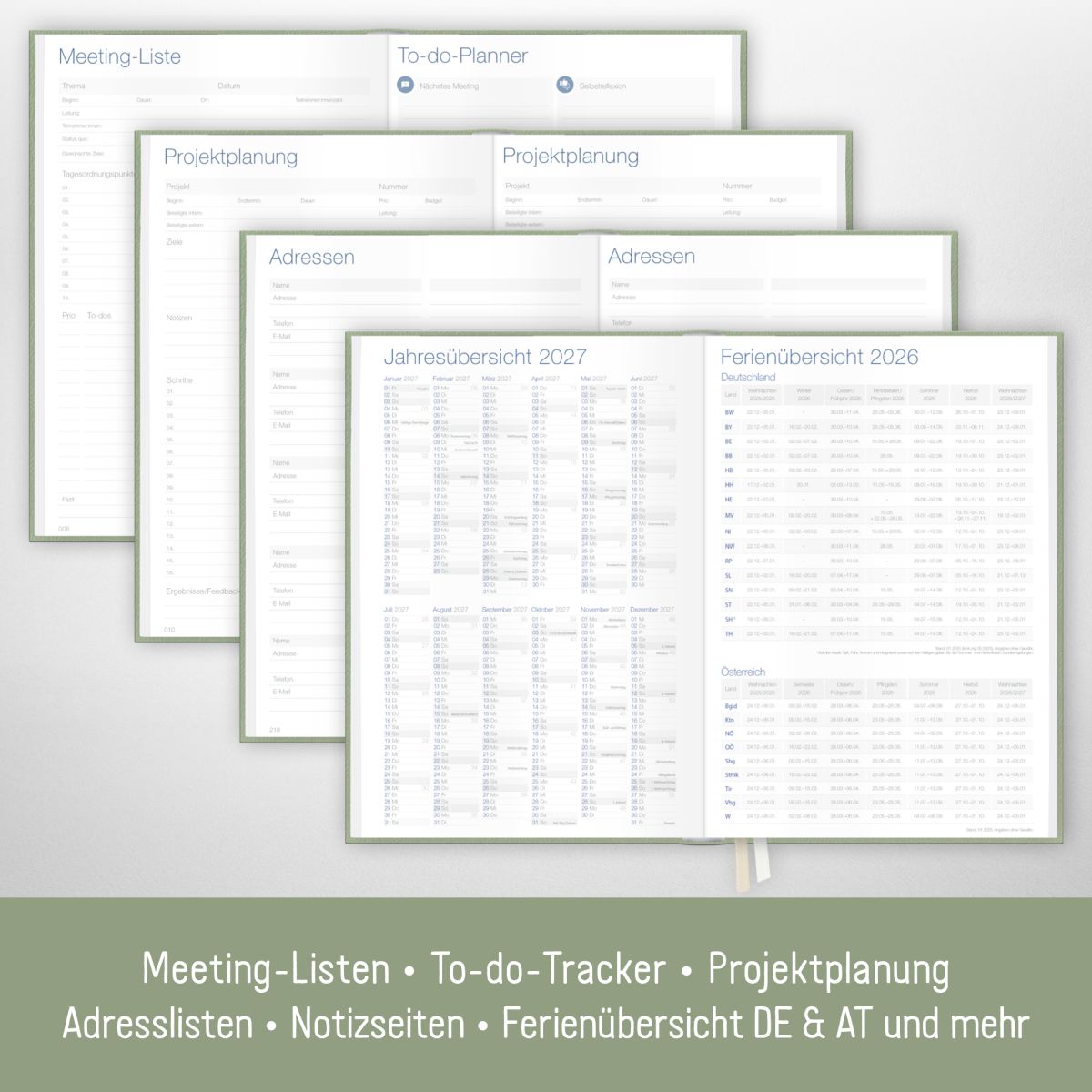 - DURCHDACHT & ÜBERSICHTLICH - Kalendarium mit Halb-Stunden-Takt, wöchentliche Top-Projekte und TO DOs, Projektplaner, Meeting-Listen, inspirierende Sprüche, Adress-Listen, Länderknigge, praktischer Fahrtkostenübersicht und mehr.