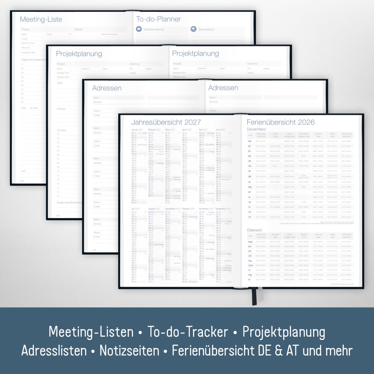 - DURCHDACHT & ÜBERSICHTLICH - Kalendarium mit Halb-Stunden-Takt, wöchentliche Top-Projekte und TO DOs, Projektplaner, Meeting-Listen, inspirierende Sprüche, Adress-Listen, Länderknigge, praktischer Fahrtkostenübersicht und mehr.