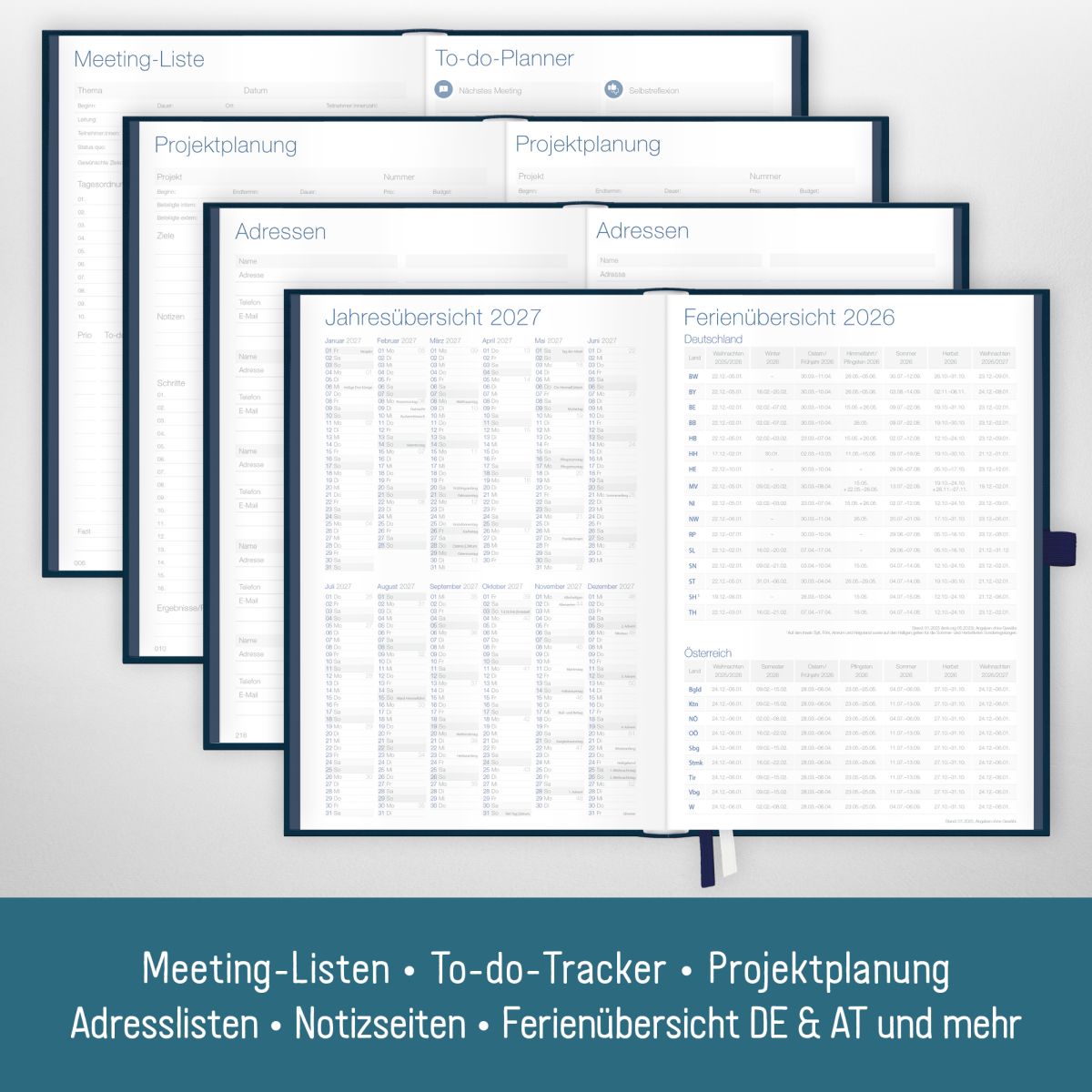 - DURCHDACHT & ÜBERSICHTLICH - Kalendarium mit Stunden- und Halbstundeneinteilung, wöchentliche Top-Projekte und To-dos, inspirierende Sprüche, Projektplaner, Meeting-Listen, To-do-Tracker, Adress-Listen, Urlaubstracker, Fahrtkostenübersicht und mehr.