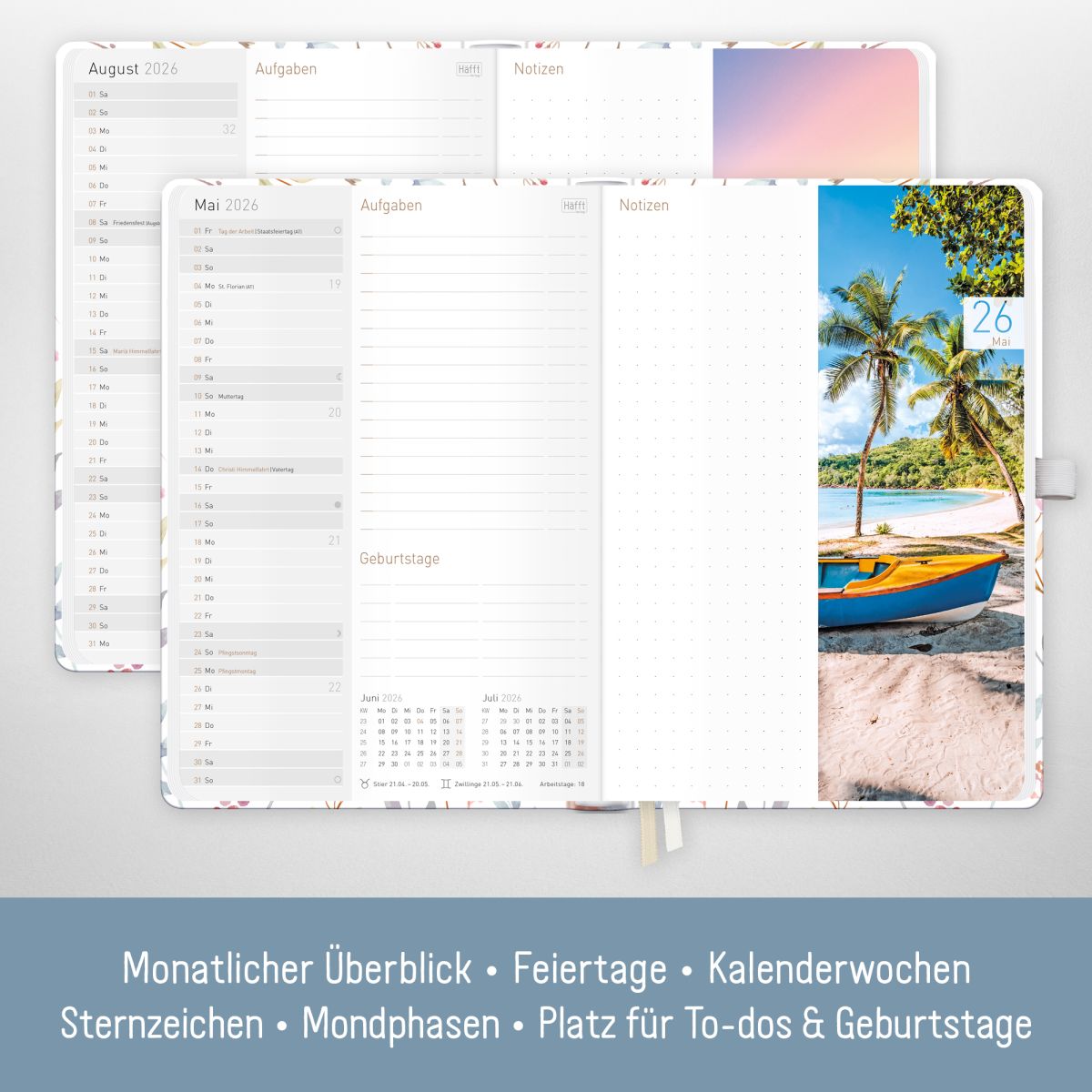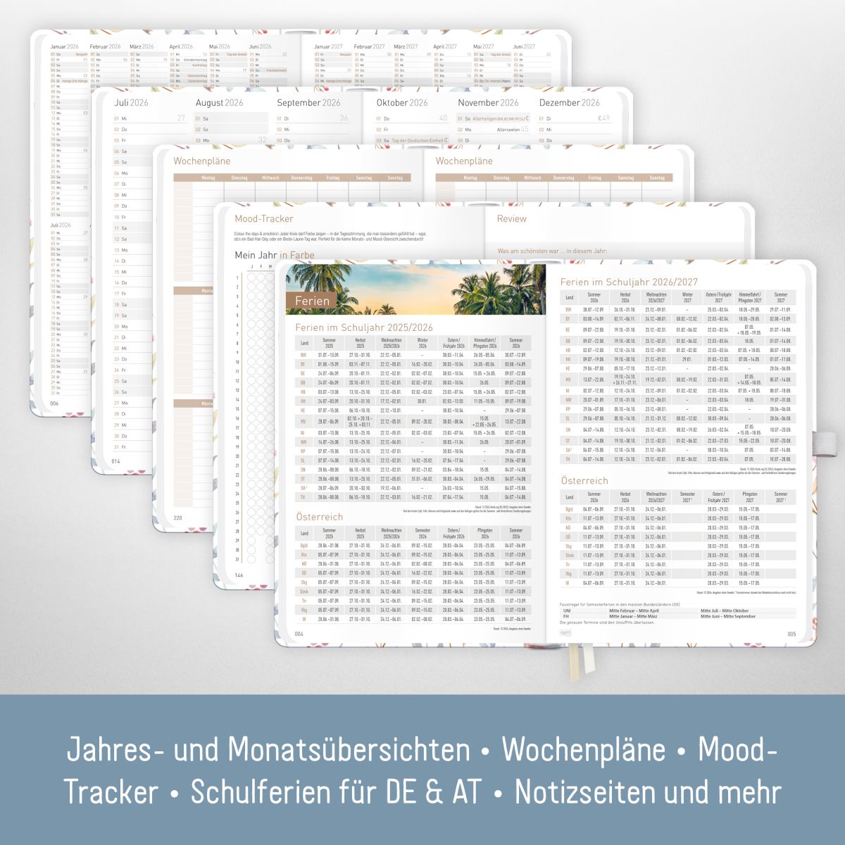 - ÜBERSICHTLICH UND DURCHDACHT - Organizer mit 1 Woche auf 2 Seiten, Monats- und Jahresübersicht, nützlichen Features wie Feiertagen und Schulferien für DE und AT, Urlaubsplaner, Wochenplänen, Mood-Tracker, Listen, Notizen & mehr.