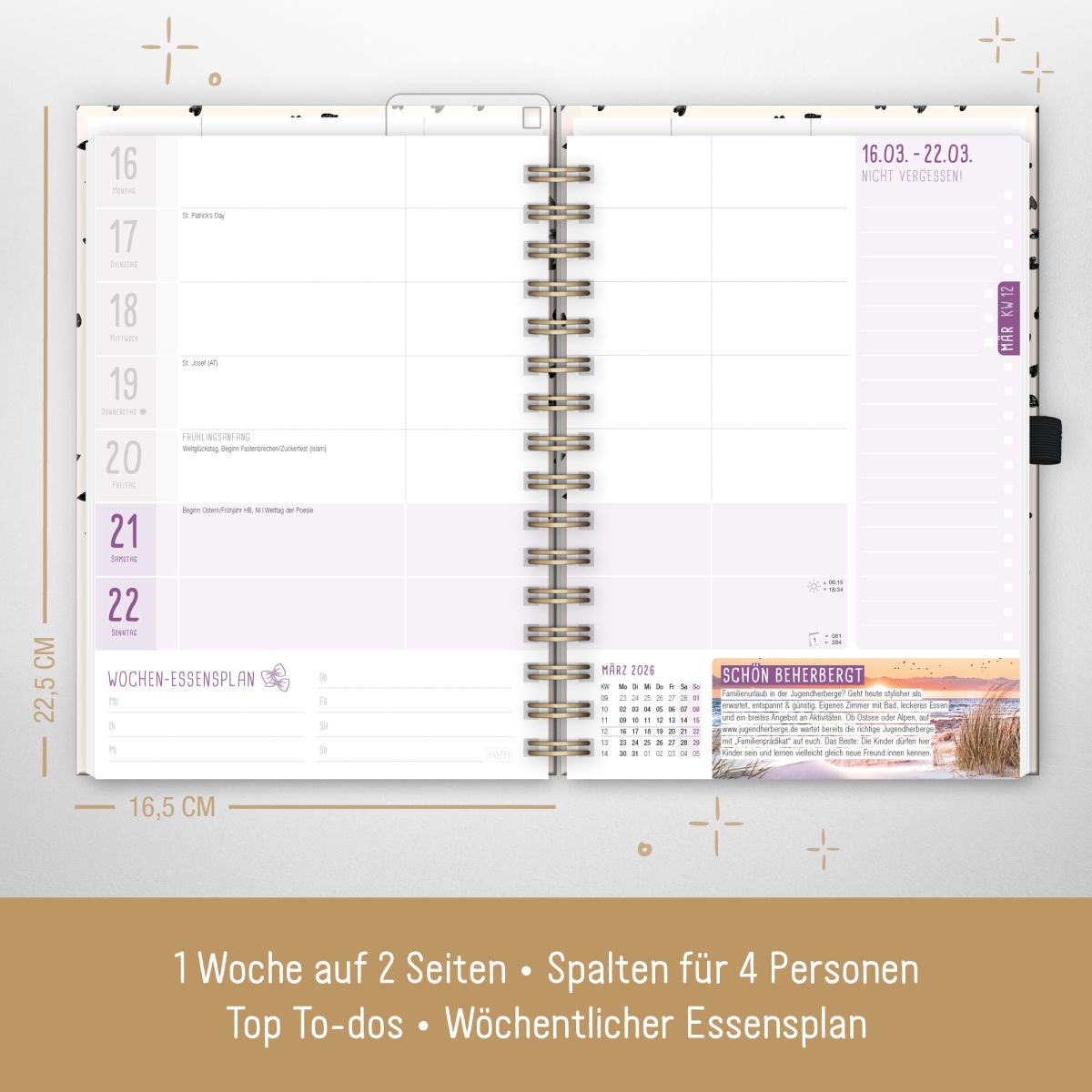 - FAMILY-MANAGEMENT MIT ÜBERBLICK - Pro Woche: Platz für Termine, To-do-Liste, Essensplan, Infos & Funfacts plus monatliche Vorschau mit Checkliste für Geburtstage, Kontakte & Prio-Aufgaben. Dazu: Feiertage und Ferien für DE & AT, Monatskalender zum Ausklappen.