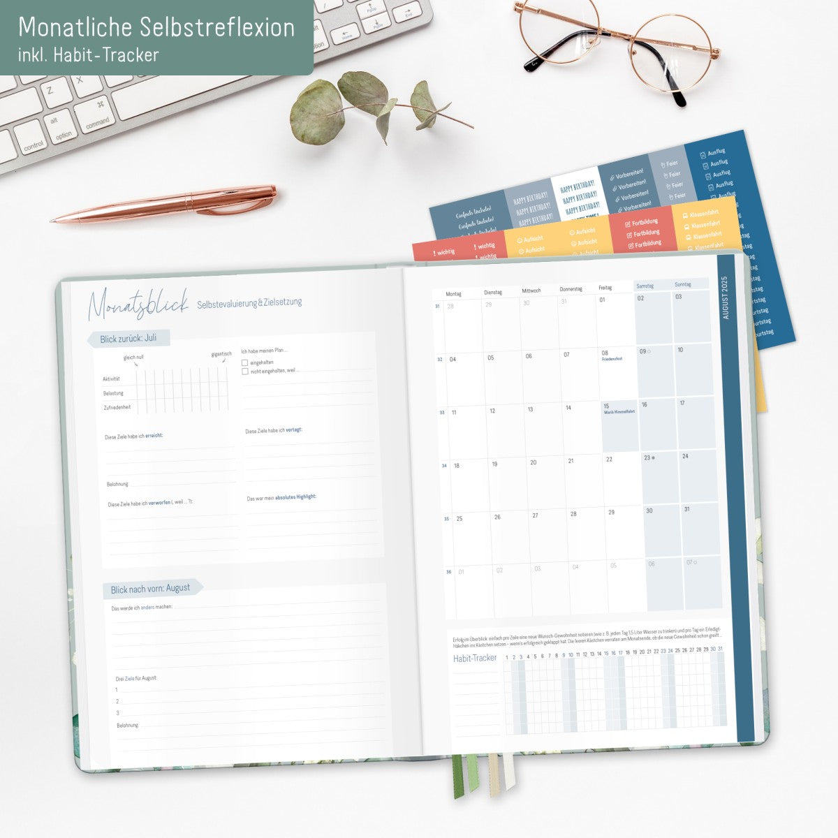 - am Ende jedes Monats: eine Doppelseite zur Selbstevaluation und Zielsetzung