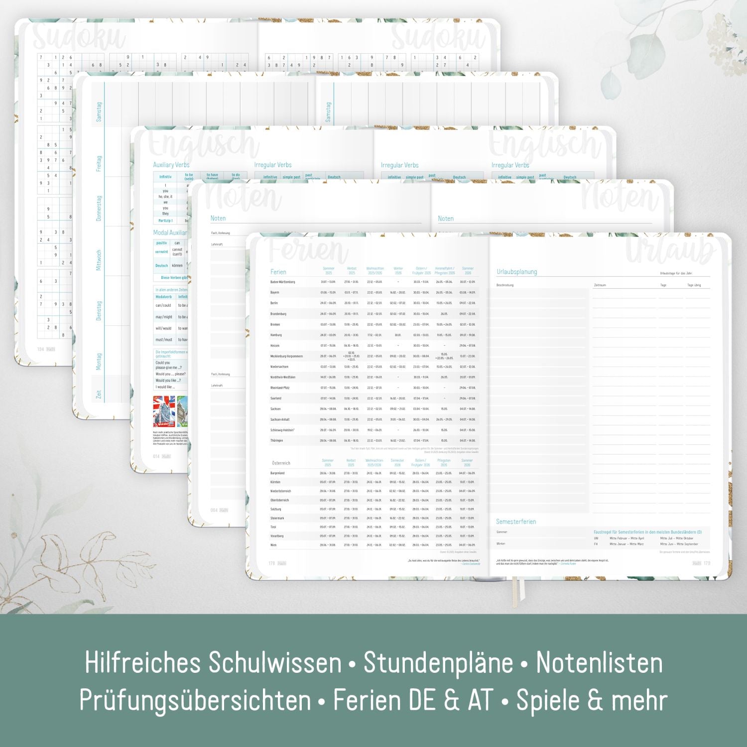 - viele Zusatzseiten, die den Alltag erleichtern: 4 Stundenpläne, Notenlisten, Lern- und Prüfungslisten, Schulwissen, Ziele und Projekte, Landkarten, Lifehacks, Urlaubsplaner u.v.m.