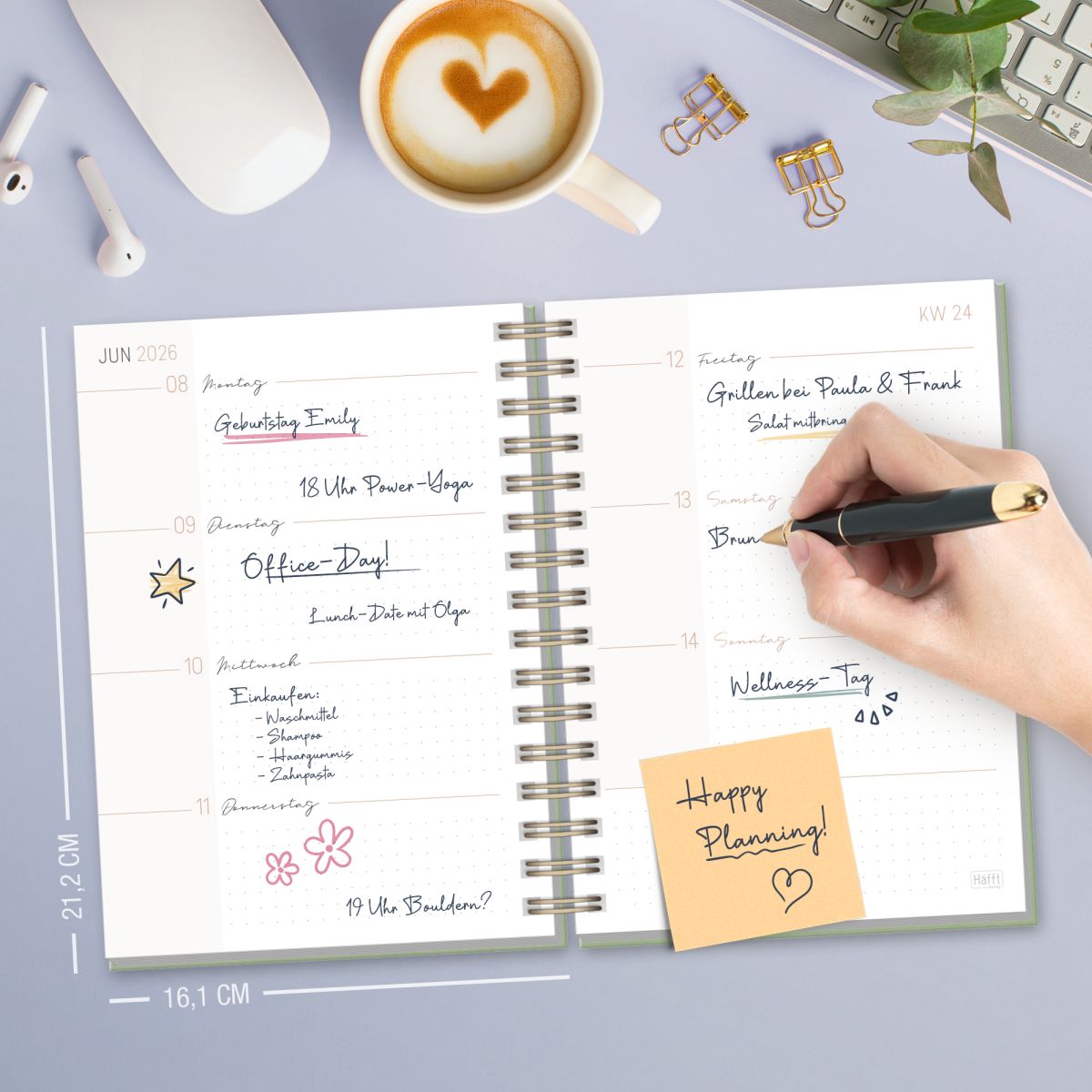 - EXTRA LIEBLINGSMOMENTE – Projekte und Persönliches im Herzensblick mit: Mood-Tracker, Bucketlist, persönlicher Rückschau auf 2026, Listen für Lebensziele, Kontakte & Urlaubspläne, Seiten für eigene Bilder & Erinnerungen zum Einkleben und dotted Notizseiten.