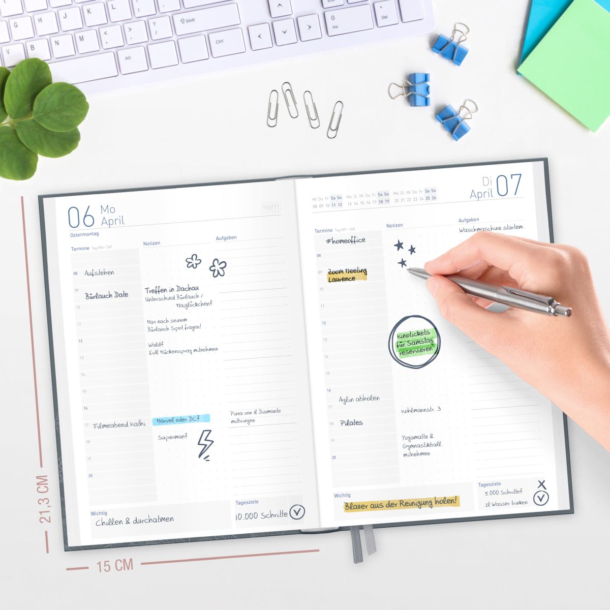 - HILFREICHE FEATURES & ZUSATZSEITEN - Tageszeiten-Einteilung, Felder für Notizen, extra Aufgabenspalte. Außerdem: Ferienübersicht (DE & AT), Urlaubsplan, Monats- und Jahresübersichten, Adressseiten und extra Notizseiten.