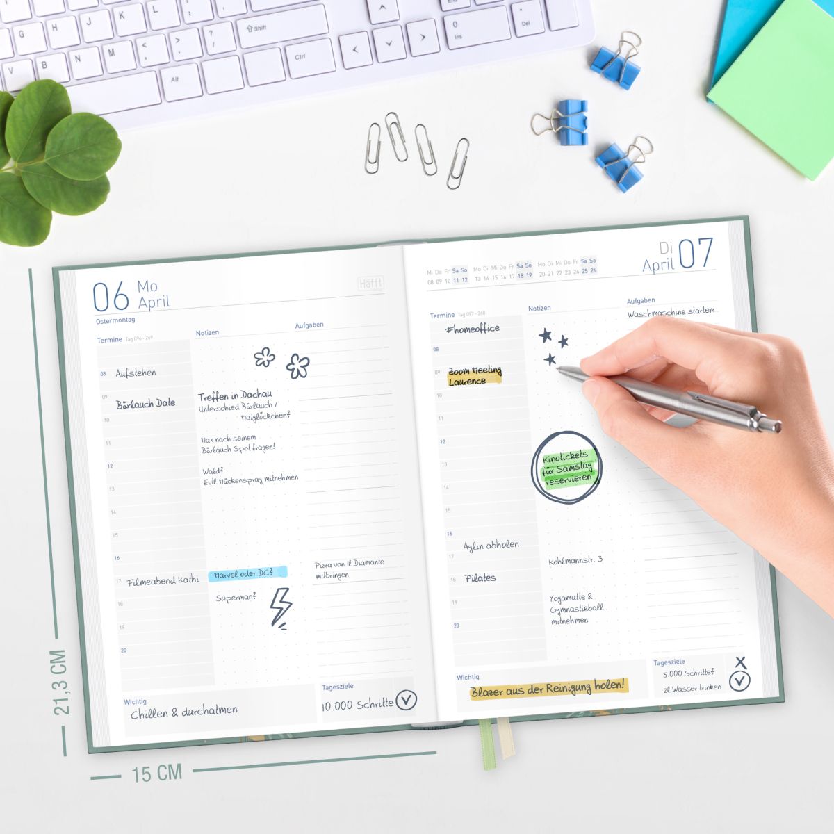 - HILFREICHE FEATURES & ZUSATZSEITEN - Tageszeiten-Einteilung, Felder für Notizen, extra Aufgabenspalte. Außerdem: Ferienübersicht (DE & AT), Urlaubsplan, Monats- und Jahresübersichten, Adressseiten und extra Notizseiten.