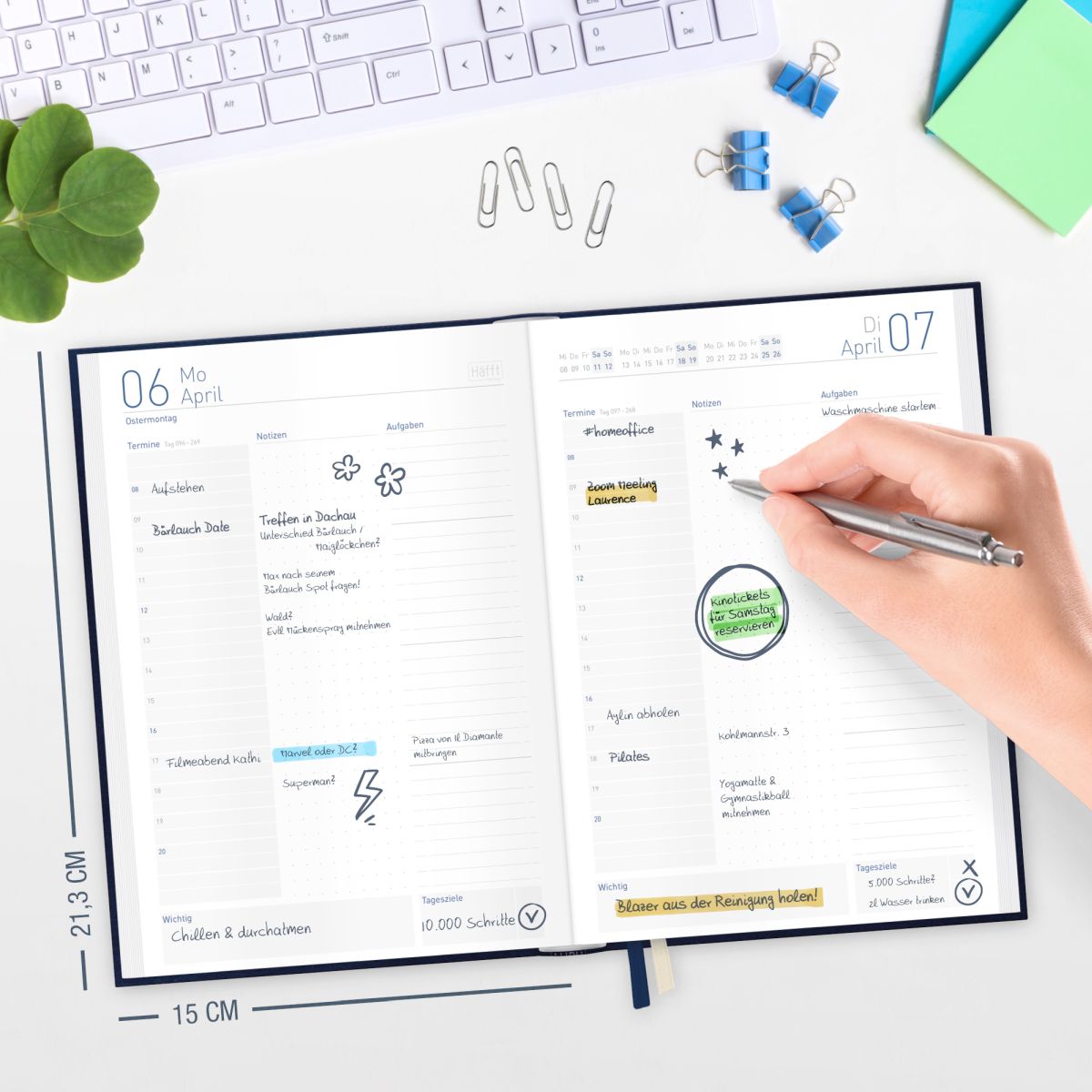 - HILFREICHE FEATURES & ZUSATZSEITEN - Tageszeiten-Einteilung, Felder für Notizen, extra Aufgabenspalte. Außerdem: Ferienübersicht (DE & AT), Urlaubsplan, Monats- und Jahresübersichten, Adressseiten und extra Notizseiten.